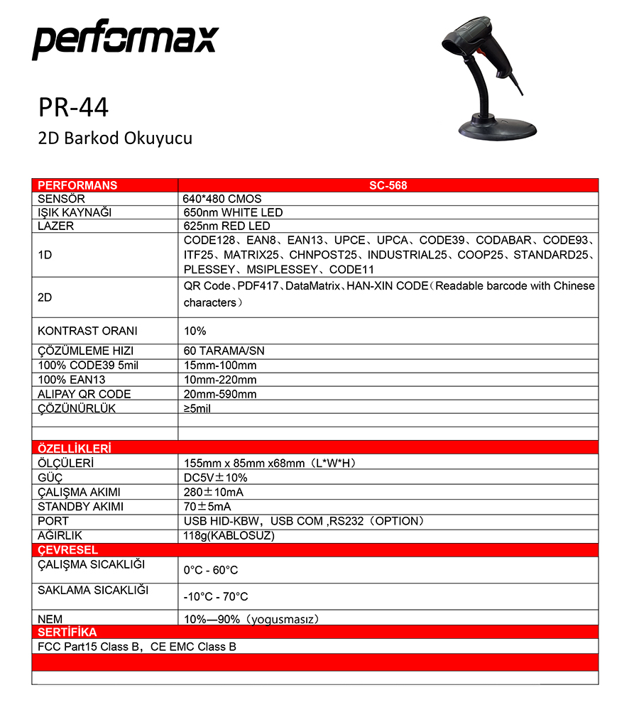 PERFORMAX PR-44, EL Tipi, USB Kablolu, 2D, Imager, Karekod Barkod Okuyucu (Stand+Otomatik Okuma)